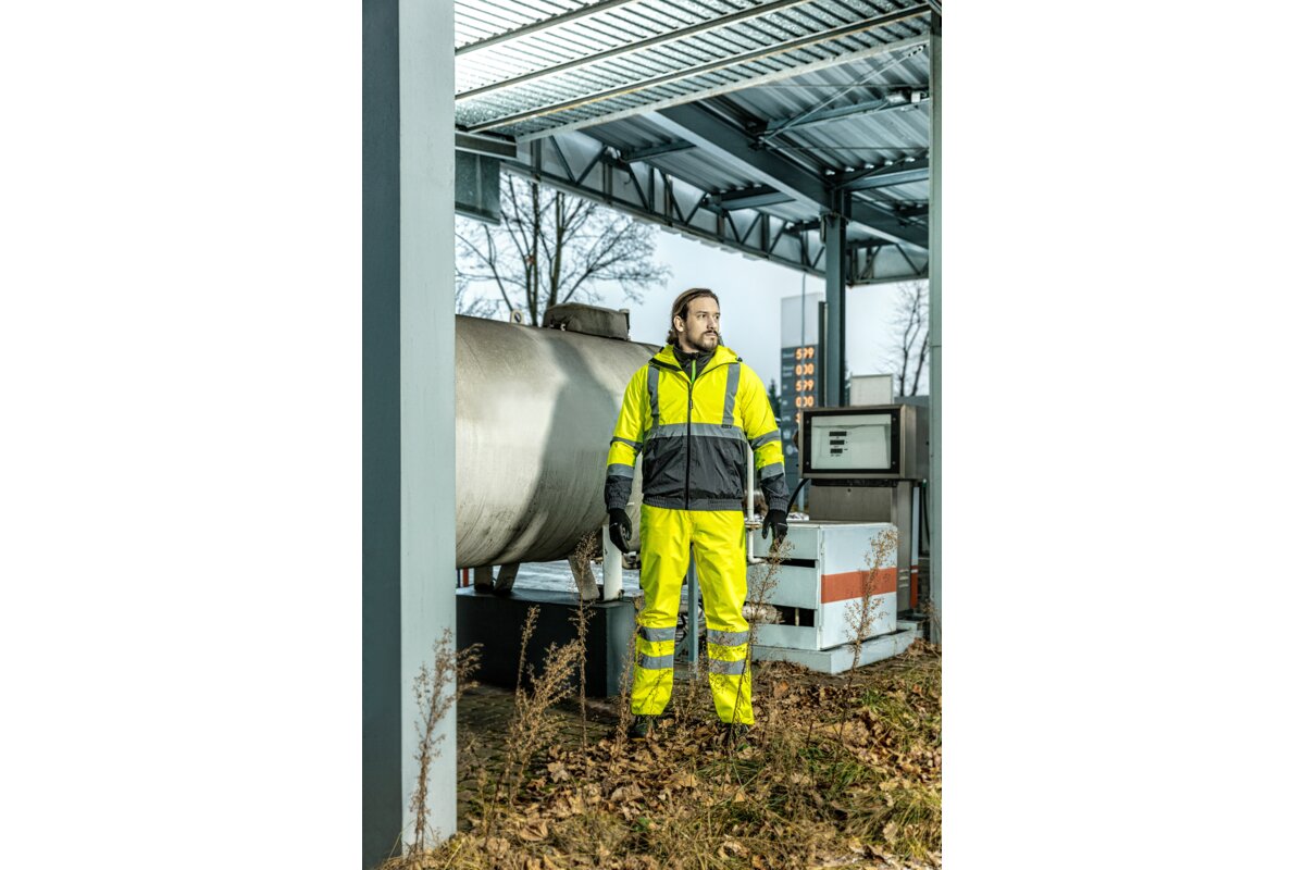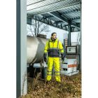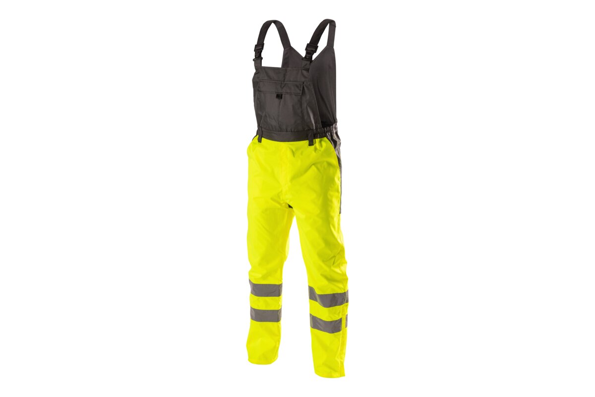 Męskie ogrodniczki ostrzegawcze przeciwdeszczowe wykonane z najwyższej jakości materiałów. Wyróżniają się lekkością i przepuszczalnością powietrza, zapewniają maksymalny komfort noszenia. Chronią przed deszczem (wodoodporność na poziomie 2000 mm H₂O) i wiatrem. Zwiększają bezpieczeństwo podczas przebywania w warunkach ograniczonej widoczności np. w trakcie przemieszczania w nocy oraz podczas złych warunków pogodowych np. w czasie deszczu lub mgły. Kolorystyka produktu jest skierowana do branż, w których pracownicy muszą być widoczni, między innymi do osób budujących drogi, ulice, rafinerie, pracujących w portach, na platformach wiertniczych, szybach wydobywczych, lotniskach czy w ratownictwie górskim.
