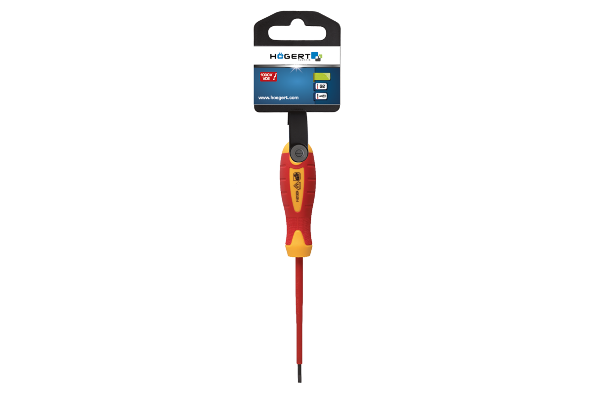 Wkrętaki płaskie 1000 V, atestowane do pracy pod napięciem. Służą do wkręcania wkrętów. Groty wkrętaków zeszlifowane po obu stronach, wyróżniają się zbieżnym i równoległym wyprofilowaniem.