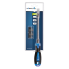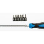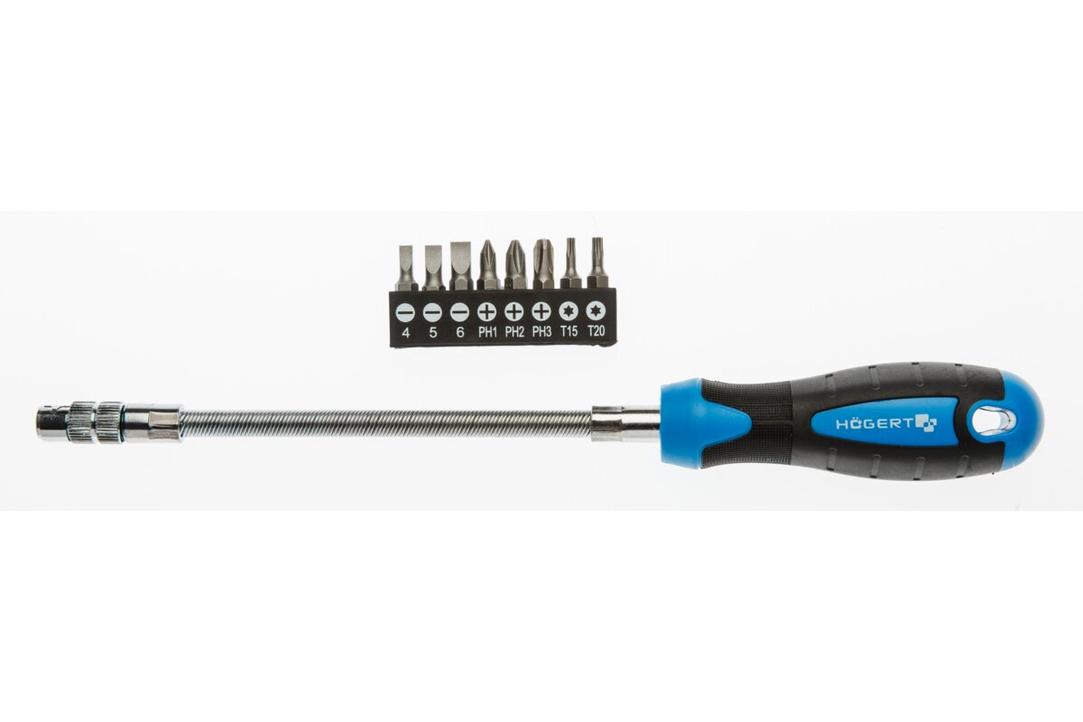 Wkrętak z grotem elastycznym 215 mm i kompletem końcówek: końcówki płaskie 4.5 mm i 6 mm, końcówki krzyżowe PH1, PH2, PH3 oraz końcówki typu Torx T15 i T20. Idealny do pracy w miejscach trudno dostępnych, gdy nie ma możliwości użycia zwykłego wkrętaka.