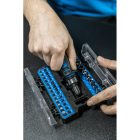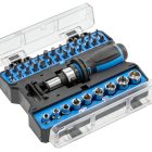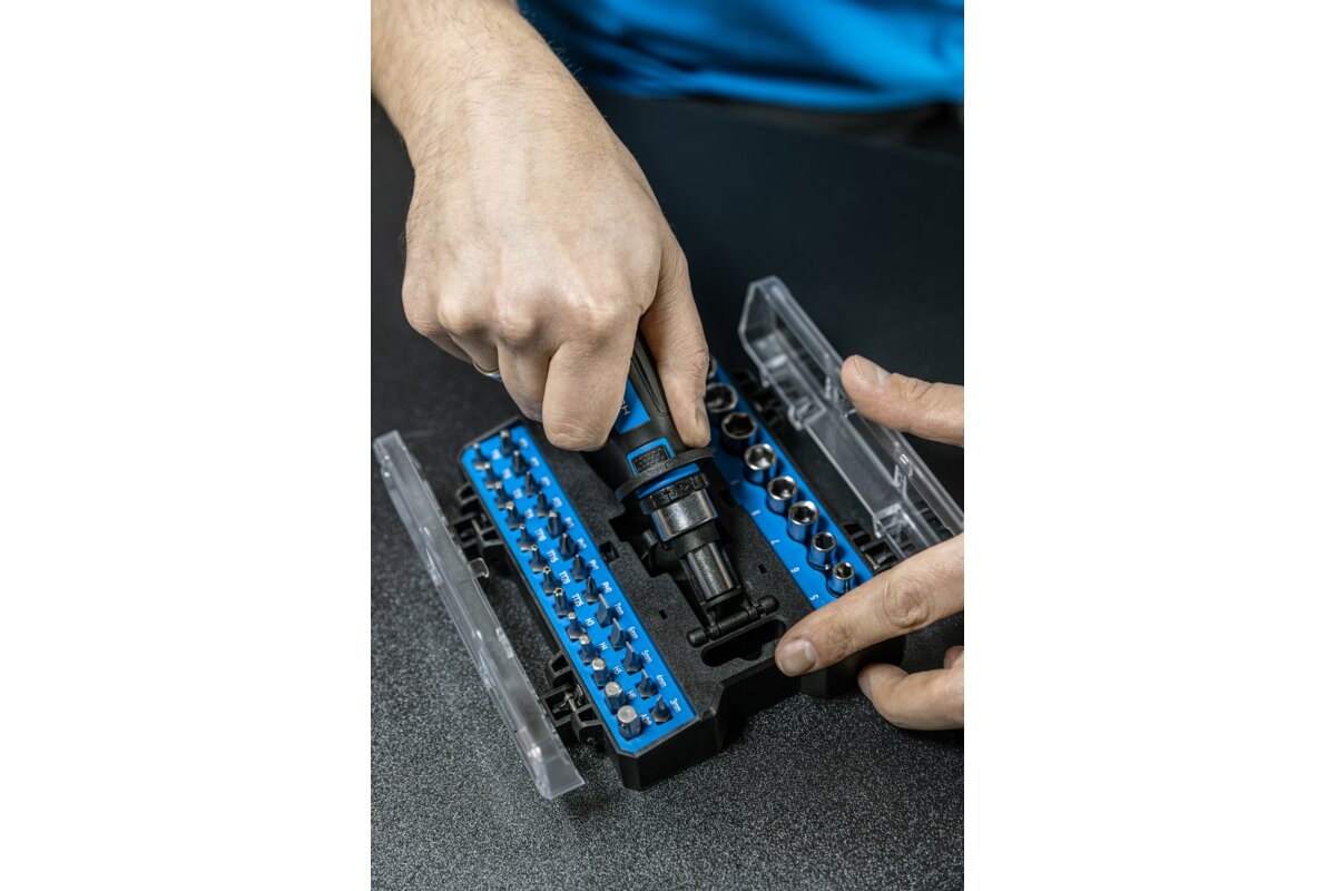Zestaw składający się z wkrętaka z grzechotką oraz 25 końcówek wkrętakowych i 9 nasadek. Całość zapakowana w praktyczny organizer ułatwiający przechowywanie. Niezbędny każdemu profesjonaliście.