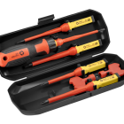 Zestaw wkrętaków VDE atestowanych do pracy pod napięciem 1000 V. Wygodna, izolowana rękojeść z systemem szybko wymiennych grotów w zestawie z 5 końcówkami roboczymi oraz 2 kluczykami do szaf rozdzielczych zapakowane w praktyczne etui. Niezbędne każdemu profesjonaliście.
