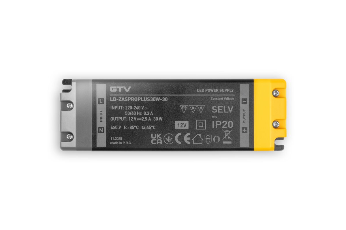 Zasilacz obniża wejściowe napięcie sieciowe 220-230 V do 12 V. Dzięki temu może być stosowany do zasilania większości taśm opraw meblowych LED. Zasilacz LED od GTV posiada zabezpieczenie przeciwzwarciowe oraz przeciążeniowe, które zwiększa bezpieczeństwo jego użytkowania.
