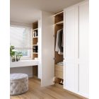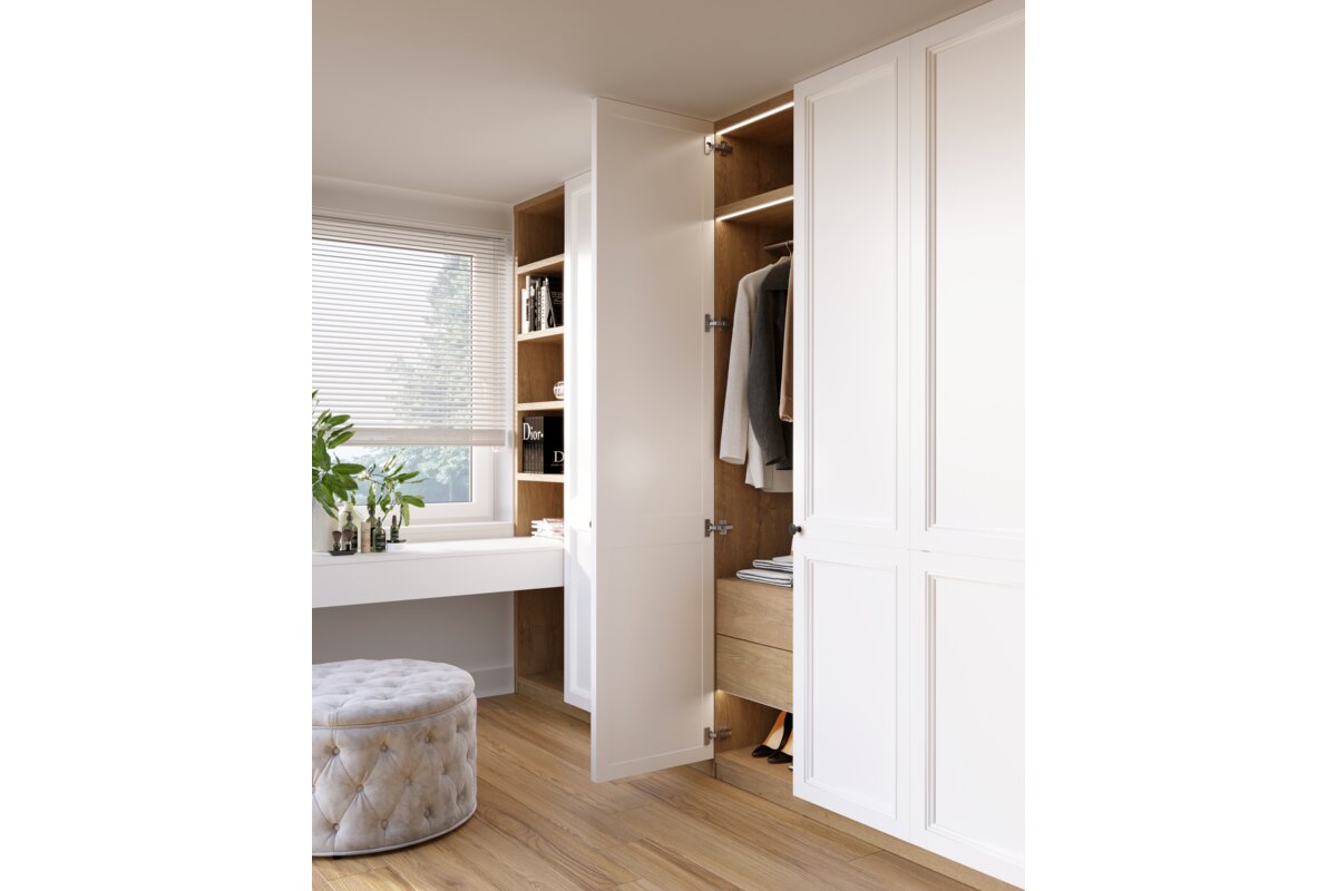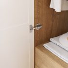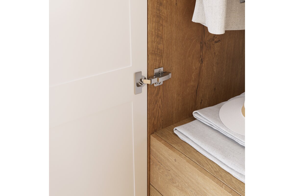 Zawias wpuszczany PRESTIGE+ wyróżnia się wytrzymałością na poziomie 80 000 cykli, potwierdzoną certyfikatem SGS. Produkt oferuje dwustopniowe działanie, umożliwiając otwieranie w dwóch różnych pozycjach, co zwiększa jego funkcjonalność. Dodatkowo, zawias posiada zintegrowaną w ramieniu regulację mimośrodową zarówno głębokości, jak i wysokości i i mocowanie prowadnika typu CLIP-ON, co pozwala dostosować go do różnych potrzeb montażowych. W zestawie znajdują się również praktyczne zaślepki oraz prowadnik.