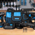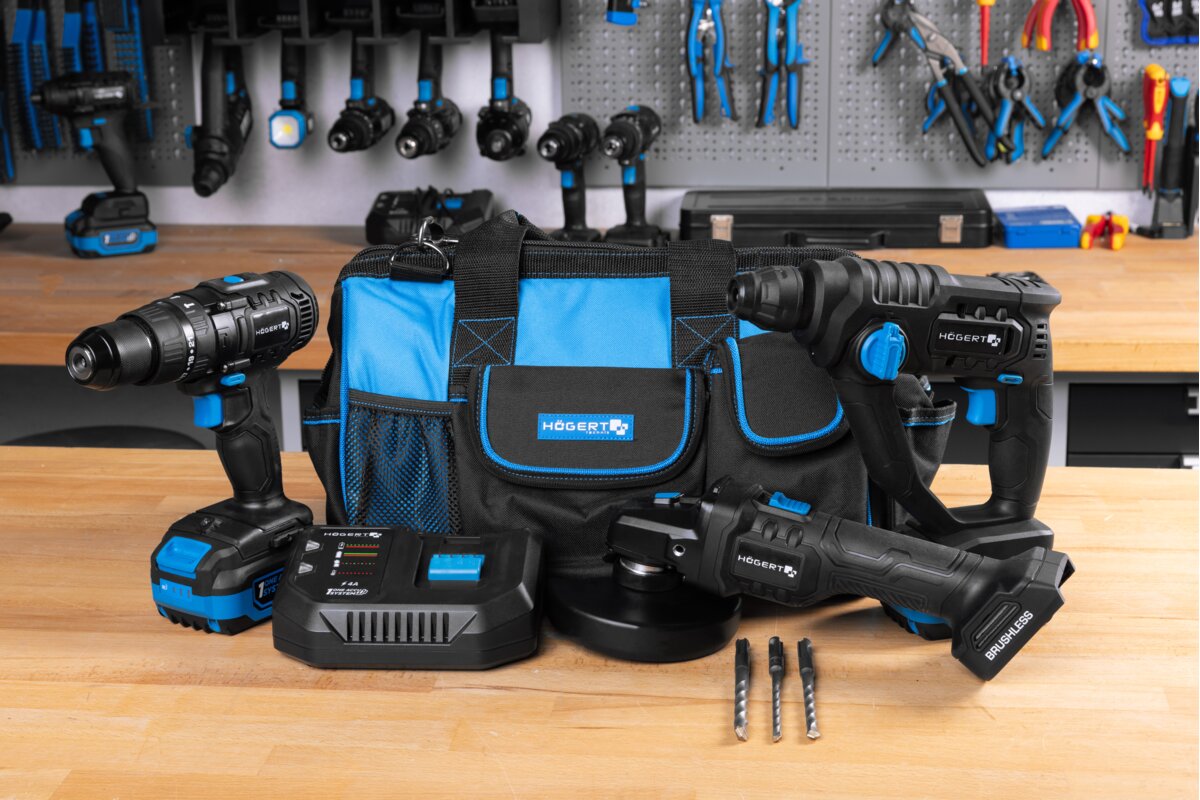 Praktyczny zestaw akumulatorowych elektronarzędzi zapakowany w poręczną torbę.