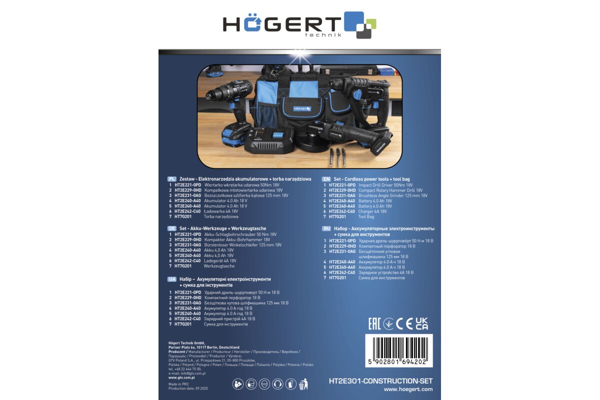 Deklaracja CE HT2E221-0PD,HT2E245-B12PD_2024_006_CE_NA_Deklaracja zgodności_PL_EN.pdf Deklaracja CE HT2E229-0HD_2024_007_CE_NA_Deklaracja zgodności_PL_EN.pdf Deklaracja CE HT2E239-A20, HT2E240-A40, HT2E241-A60_024_CE_NA_Deklaracja zgodności_PL_EN.pdf Deklaracja CE HT2E231-0AG, HT2E250-B24AG_2024_012_CE_NA_Deklaracja zgodności_PL_EN.pdf Deklaracja CE HT2E242-C40, HT2E243-C60_2024_018_CE_NA_Deklaracja zgodności_PL_EN.pdf Instrukcja HT2E222_246__wiertarko-wkretarka_akumulatorowa__instrukcja_2.pdf Instrukcja HT2E229-0HD_mlotowiertarka__instrukcja_1.pdf Instrukcja HT2E231_250__szlifierka_katowa_instrukcja_2.pdf Instrukcja HT2E240-A40__akumulator__instrukcja_3.pdf Instrukcja HT2E242-C40__HT2E243-C60_HT2E299-C40GB_ladowarka__instrukcja_4.pdf Karta produktowa HT2E301-CONSTRUCTION-SET_PL.pdf