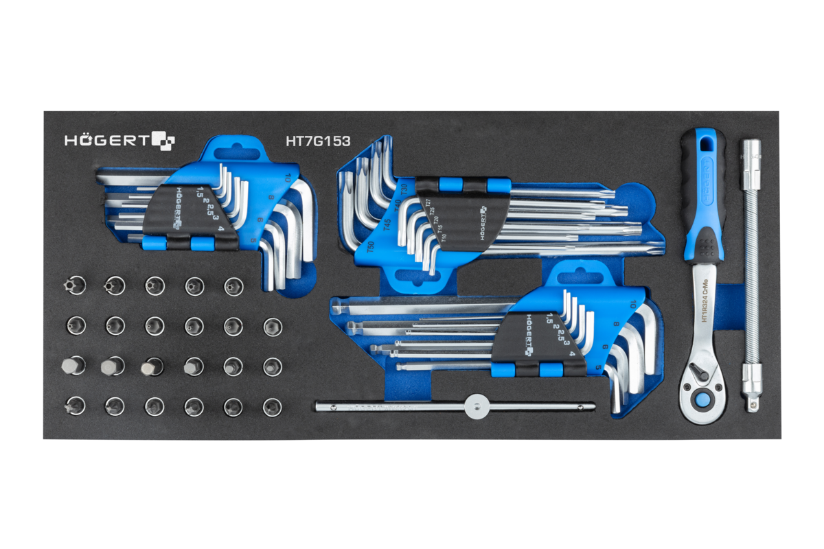 Wkład do szafek narzędziowych z zestawem kluczy imbusowych oraz trzpieniowych z akcesoriami 1/4”, umożliwia dobór odpowiedniego klucza potrzebnego przy odkręcaniu śrub. Niezbędny w szafce każdego profesjonalisty.
