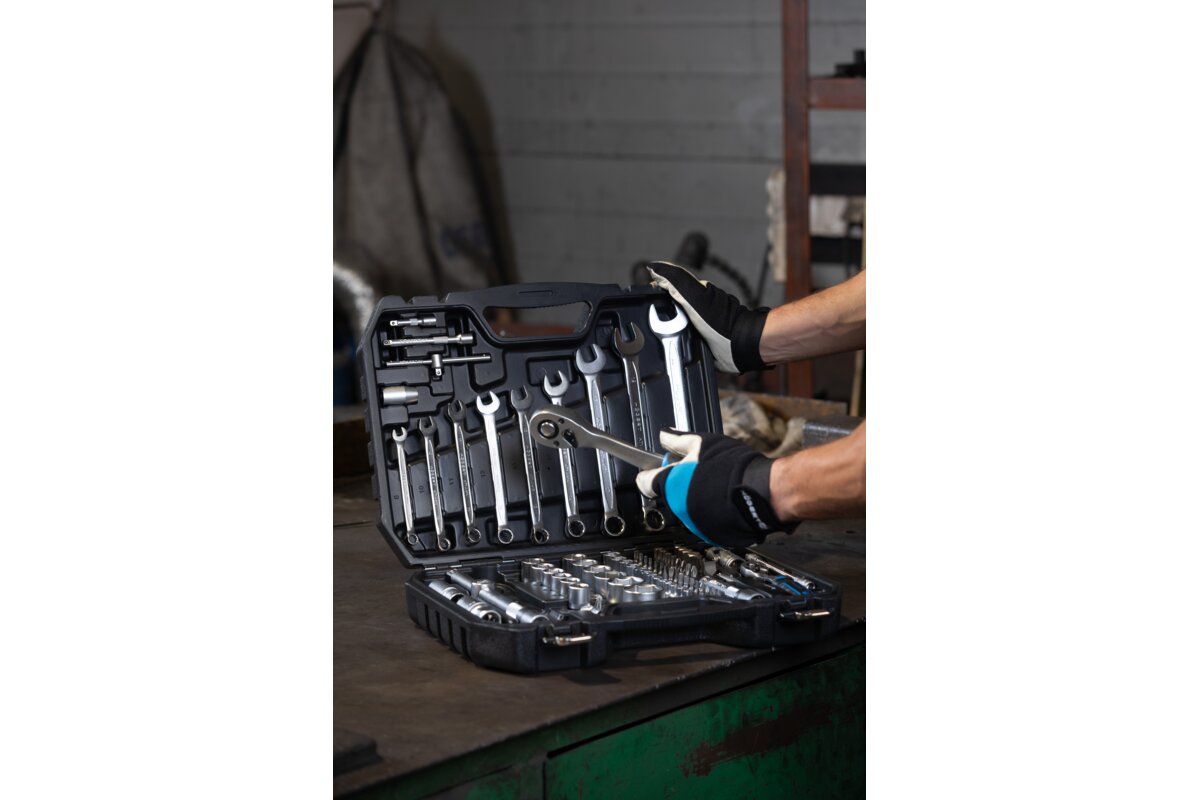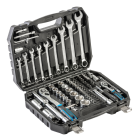Zestaw nasadek, końcówek wkrętakowych, akcesoriów 1/4” i 1/2” oraz kluczy płasko-oczkowych.85 elementów.
